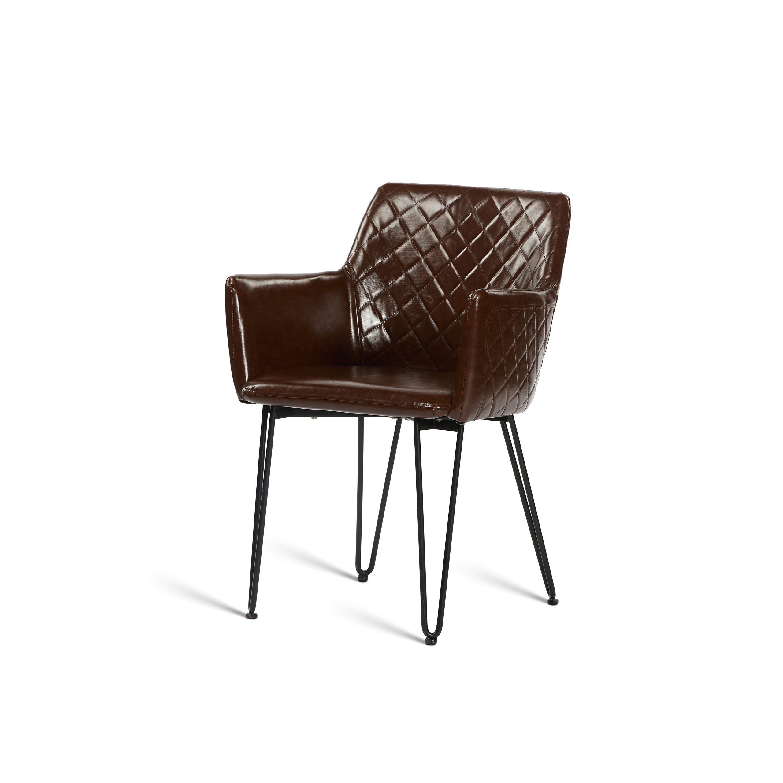 The Bowie chair features a rich brown faux leather seat and backrest with a quilted pattern. The sleek black metal legs add a modern touch and suit any event.